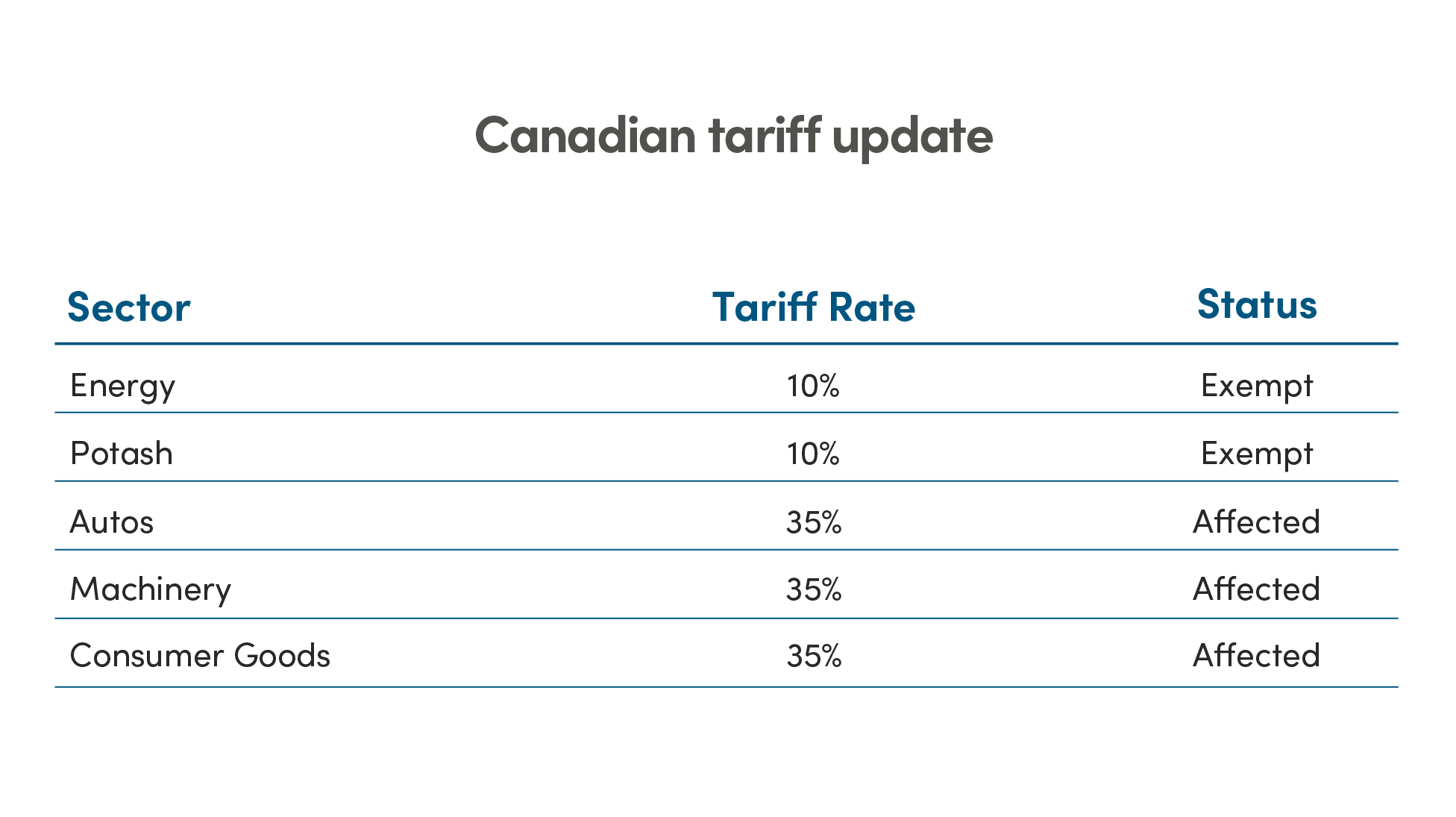 Stay flexible. Tariff risks persist, but markets stay calm: Canada faces a 35% tariff on non-CUSMA goods starting August 1, yet markets have remained resilient. Bottom line: Tariffs are back in focus. Watch for sector-specific impacts, especially in manufacturing and retail.