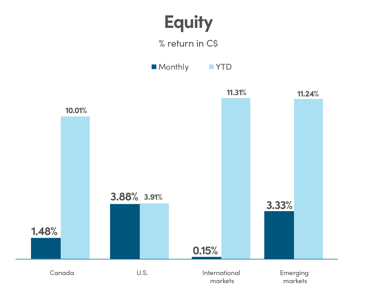 Canada: MSCI Canada Index TR; U.S.: MSCI USA Index TR International: MSCIEAFE Index TR; Emerging markets: MSCI Emerging Markets Index TR.