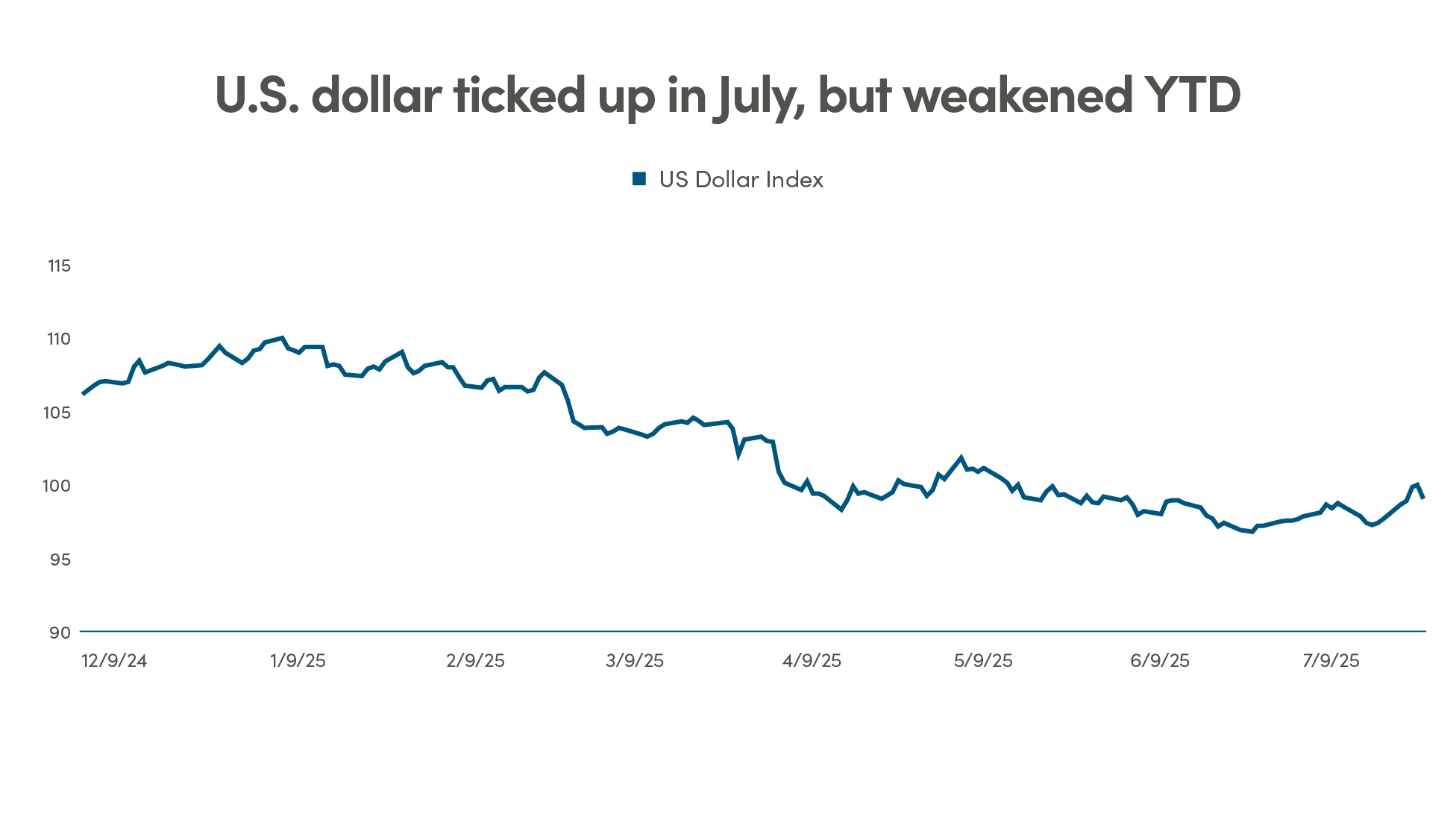 Initially, markets interpreted the Fed’s stance as supportive. But sentiment shifted dramatically in the final days of July. Stronger-than-expected Q2 GDP growth (3% annualized) and firmer inflation readings conflicted with negative revisions and a much weaker than expected jobs report on August 1, which raised the likelihood of rate cuts in September. Equity markets pulled back, Treasury yields fell, and the U.S. dollar weakened, reflecting renewed uncertainty about the Fed’s path forward.
